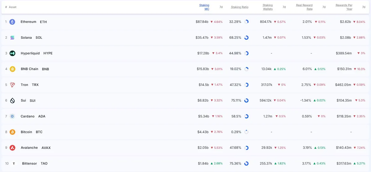 최근 암호화폐 시장에서는 스테이킹 시가총액이 전반적으로 감소하는 조정세가 나타나고 있습니다. 스테이킹 리워드 집계에 따르면, 이더리움은 여전히 스테이킹 시가총액 1위를 유지하고 있지만, 전주 대비 4.64% 줄어든 878억4000만 달러를 기록했습니다. 이는 시장의 전반적인 하락세와 맞물려 있으며, 투자자들의 심리가 위축된 것을 반영하고 있습니다.