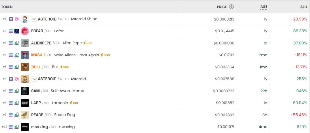 24일 기준으로 DEX 스크리너에서 가장 많이 거래된 쌍은 ASTEROID(WETH)로, 현재 가격은 0.0003213달러로 24시간 동안 23.99% 하락했습니다. 한편, 두 번째로 인상률이 높은 FOFAR(SOL)는 86.47% 상승한 0.00004419달러에 거래되고 있습니다. ALIENPEPE(SOL)도 37.00% 상승하여 0.0001030달러를 기록하며 주목을 받고 있습니다.