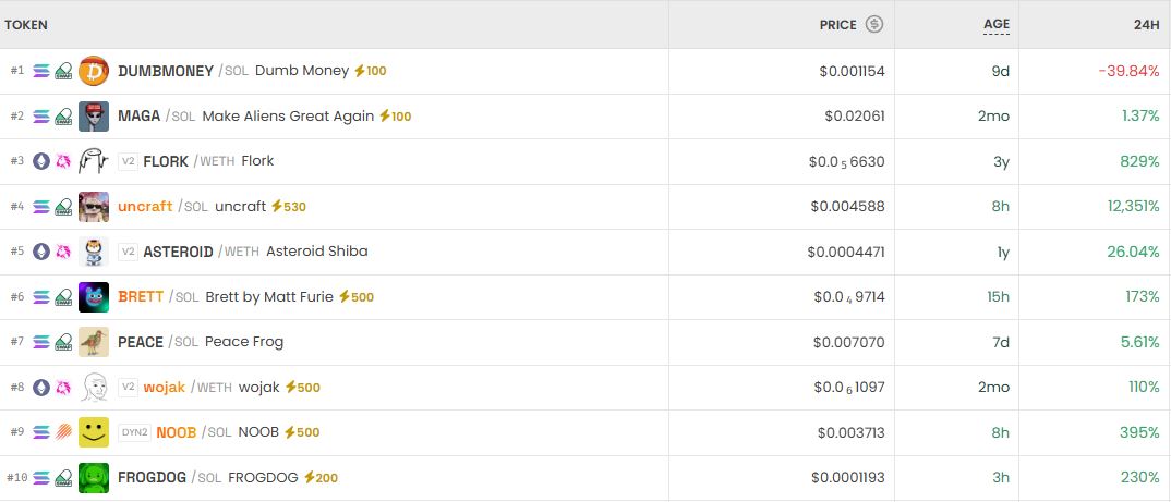 최근 탈중앙화 거래소(DEX) 시장에서 FLORK가 주목받고 있습니다. 20일 기준으로 FLORK는 24시간 동안 무려 777% 상승하며 투자자들의 이목을 끌었습니다. FLORK의 급등은 DEX 시장에서의 변동성을 잘 보여주는 사례로, 이와 함께 DUMBMONEY(SOL)와 MAGA(SOL)도 각각 39.56%와 1.53%의 하락 및 상승률을 기록했습니다. 이러한 거래쌍들은 현재 시장에서 가장 활발하게 거래되고 있는 자산들 중 하나입니다.