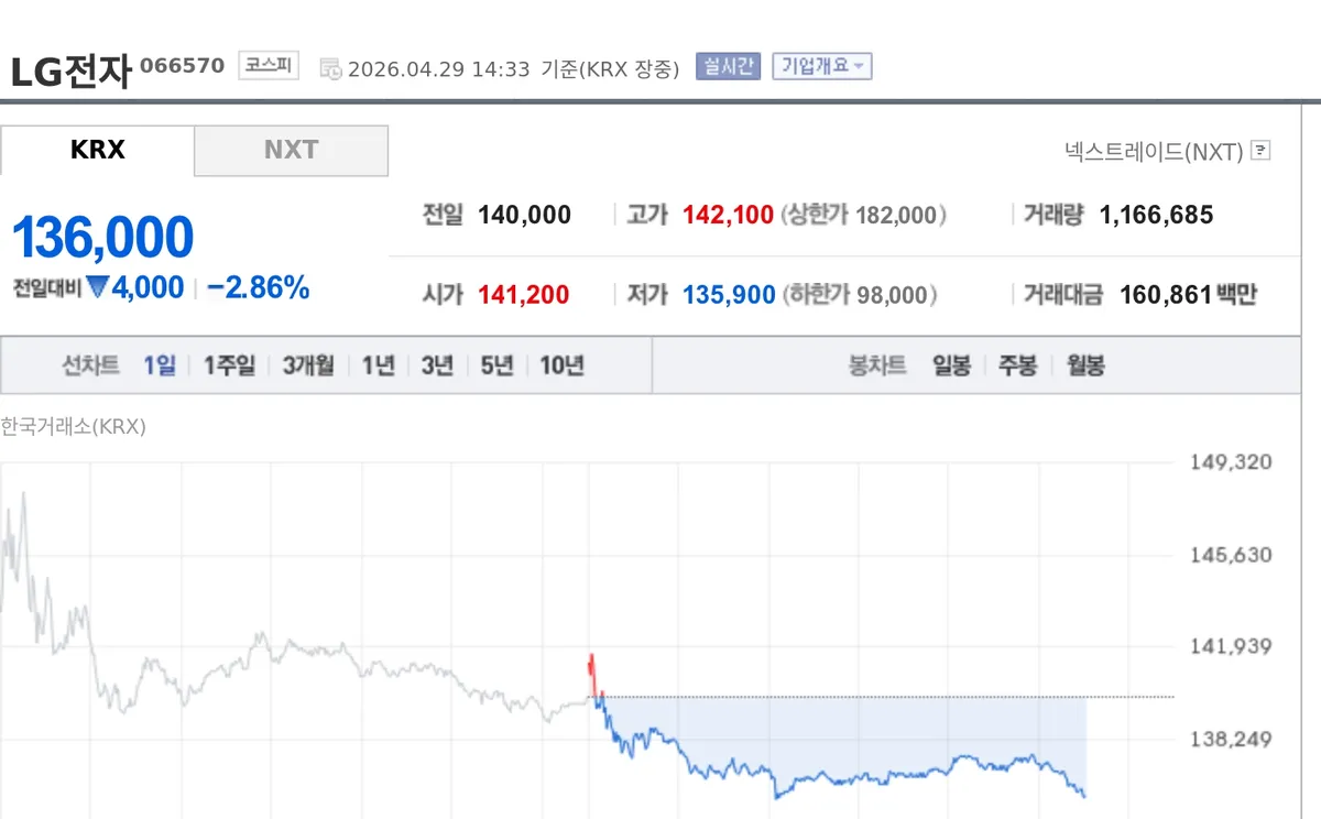 LG전자가 발표한 1분기 실적이 역대 최대치를 기록했음에도 불구하고, 주가는 약세를 보이고 있어 주목을 받고 있습니다. 한국거래소에 따르면, LG전자의 주가는 13만6000원에 거래되며, 전일 대비 2.86% 하락했습니다. 이러한 주가 하락의 원인으로는 향후 수익성에 대한 대외 변수들이 투자자들에게 부담으로 작용하고 있다는 분석이 나오고 있습니다.