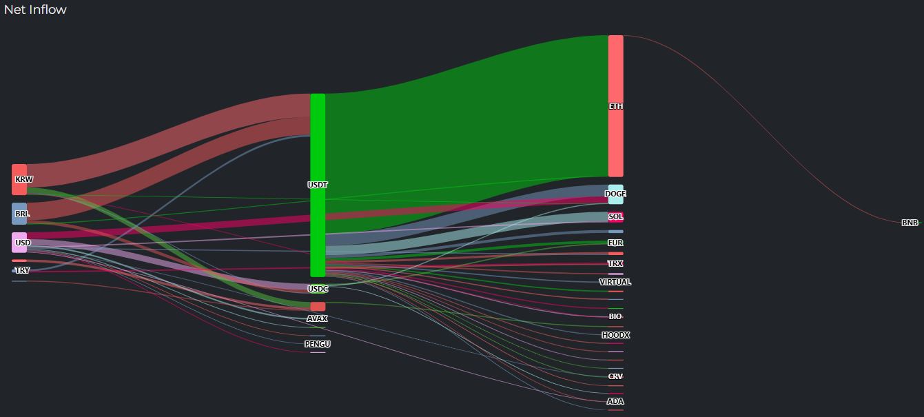 최근 암호화폐 시장에서 테더(USDT) 자금이 2985만 달러 규모로 여러 암호화폐로 분산되는 현상이 나타났습니다. 이번 자금 흐름은 특히 이더리움(ETH)에서 1138만 달러가 유출되면서 주목을 받고 있습니다. 23일 오후 10시 50분 기준으로 집계된 데이터에 따르면, 최근 5시간 동안 원화(KRW), 브라질 헤알(BRL), 달러(USD)와 같은 주요 통화에서 504만 달러, 354만 달러, 329만 달러가 각각 암호화폐 시장으로 유입되었습니다.